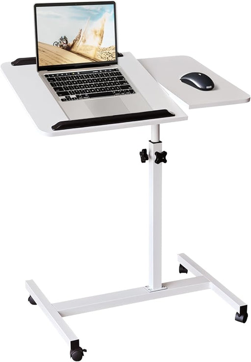 Adjustable Laptop Table for Bed Couch Sofa, Portable Standing Desk with Rolling Casters for Home Office, C Shaped Small Study Table, Tiltable & Stable (White)